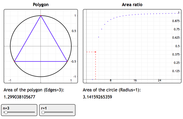 This file shows a graphical approximation of a circle with polygons with n edges. It also calculates the area of the polygon.