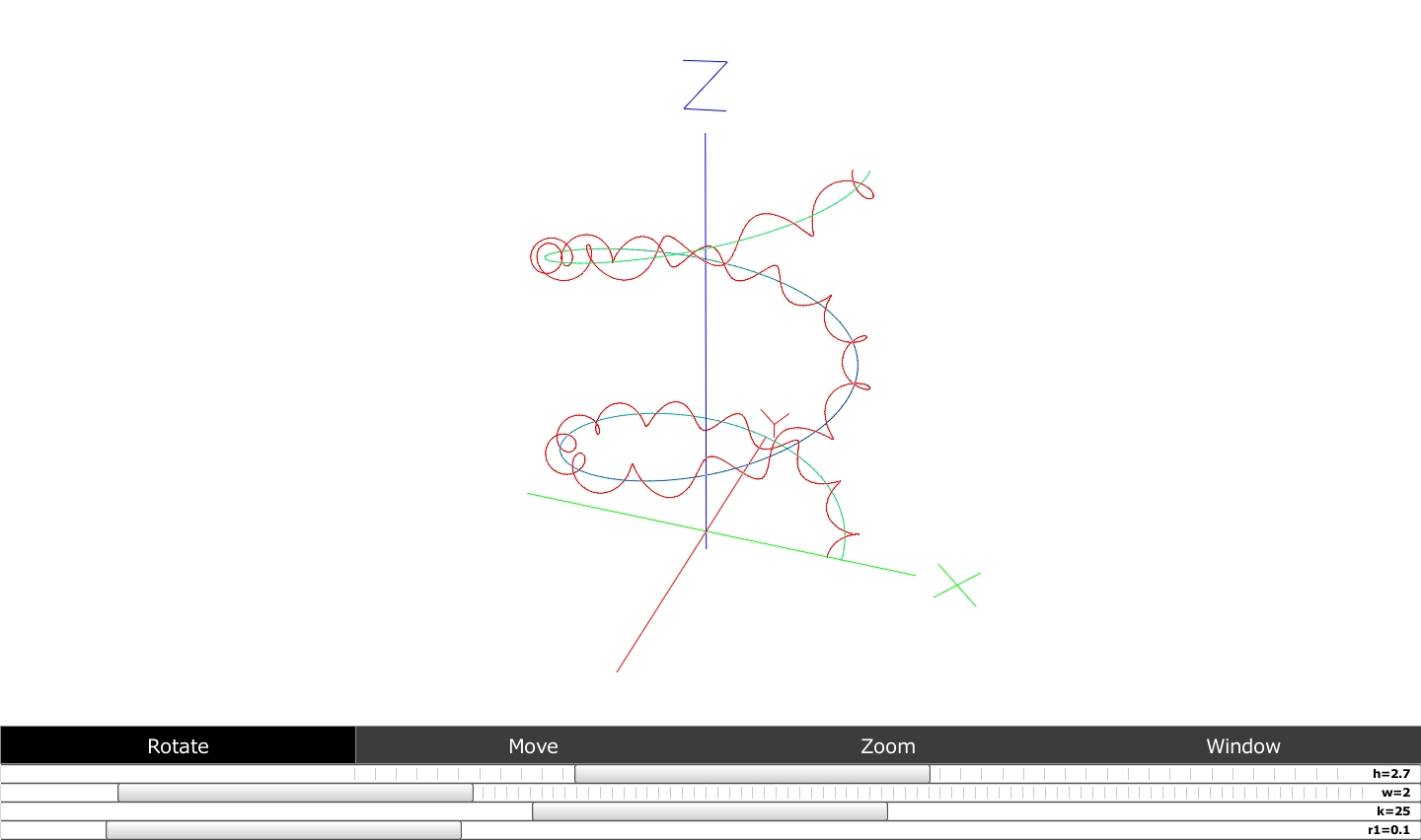 A helix spiraling up another helix. sliders were included to adjust the number of rotations and the radius of curvature for both helices.