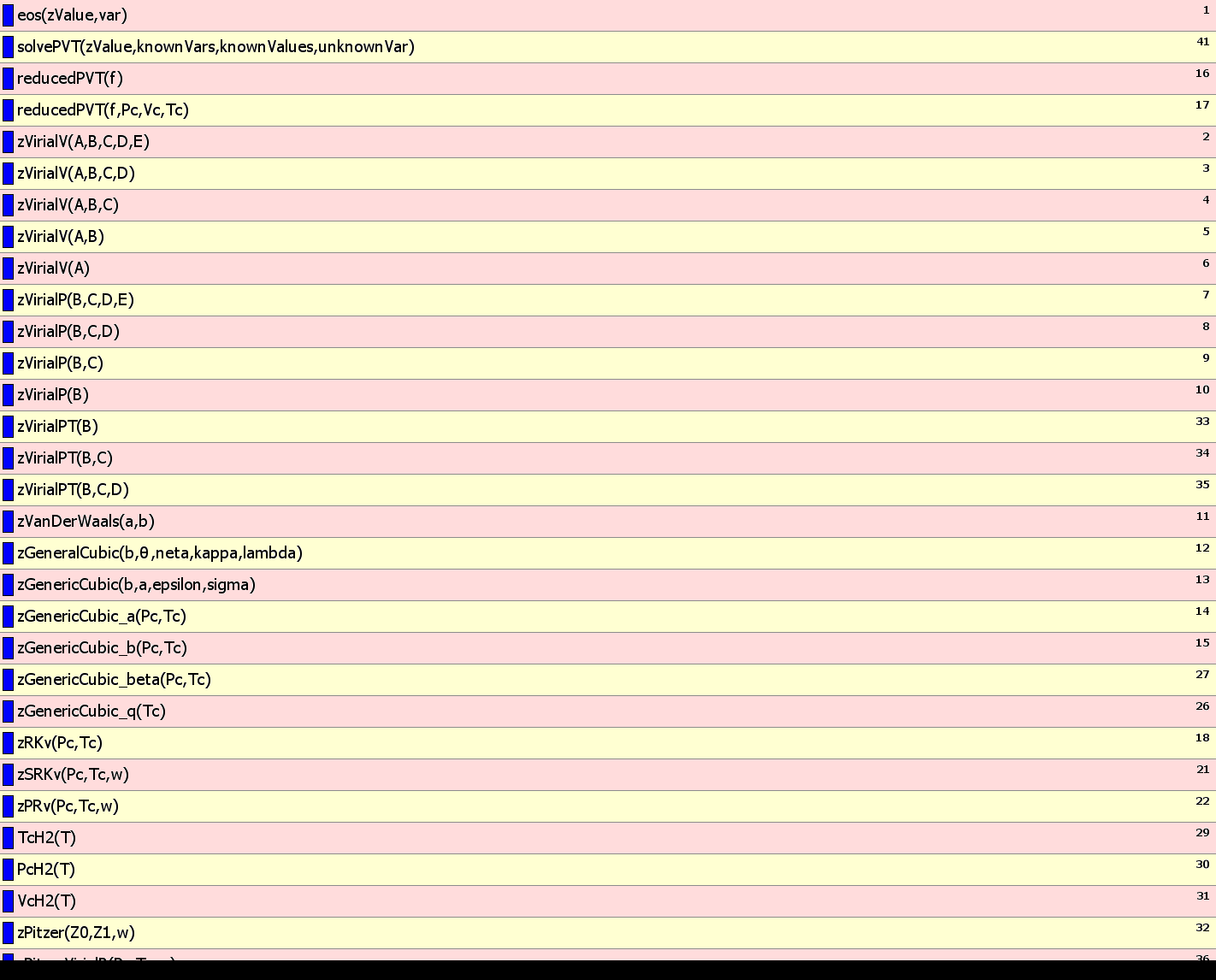This package of functions is the beginnings of a thermodynamics package. This solves for the z values in equations of states for liquids and gases in the well-known equation PV=zRT. Equations of state can produce accurate results, but it always seemed to me that the more accurate the results, the more time-consuming and taxing it is to obtain them.