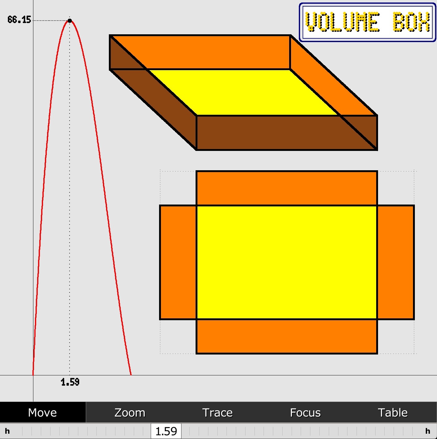 Here an application to search the maximum volume of a box modifying the high with animation.